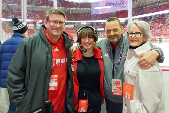 Head coach Ken Pauly (left) and Craig Roberts (2nd from right) are joined by Pauly's daughter, Caroline ('19), and wife, Anne-Marie Dominguez, at the Kohl Center in Madison, Wis.